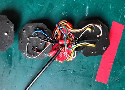 Po kilku próbach z różnymi mikroprzełącznikami, do obsługi d-pada przycisków zdecydowałem się użyć przełączników typu RK61, ponieważ są odpowiednio czułe i "miękkie" przy nacisku. Można je znaleźć na portalach aukcyjnych typu Ebay, Allegro czy Aliexpress. Ponieważ nie znam się na projektowaniu płytek PCB, zdecydowałem się osadzić przełączniki na płytkach wydrukowanych w 3D i lutować przewody do odpowiednich zacisków poszczególnych przełączników: