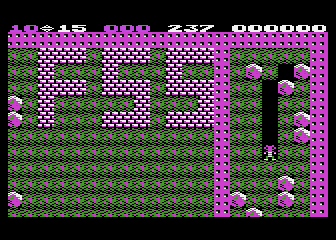 PL: Pierwotnie, we wczesnym stadium powstawania silnika i zasad fizyki gry, Rockford był tylko statycznym kształtem, krzyżykiem czy czymś podobnym. Kiedy poruszałeś tym kształtem, to kopał on ziemię i pochłaniał klejnoty. W rzeczywistości grafika byla bardzo prosta, a elementami były pojedyncze znaczki wyświetlane w matrycy 24 na 20. Nie było żadnego scrollingu we wczesnej wersji gry. Myślę, że w którymś momencie Chris zasugerował, żeby kopiący krzyżyk był "ludzikiem" i wystartowaliśmy z prostym, ludzkim kształtem. Kiedy tą wczesną wersję pokazałem potencjalnemu wydawcy, powiedział, że "ludzik" jest zbyt mały i powinien być bardziej rozpoznawalnym charakterem. Ale nie mogłem go powiekszyć bez powiekszenia wszystkich pozostalych elementów. Tutaj zaczęła się więc ciężka praca nad konwersją gry z tej wersji, w której można było poruszać się w polu 24 na 20 znaków w tą, w której był dużo większy, scrollowany obszar. Jaskinie wciąż miały szerokość 40 elementów, ale teraz każdy element składa się z czterech znaków ułożonych w matrycy 2 na 2 znaki. Tak więc każda jaskinia miała obecnie 80 znaków w poprzek ekranu i wprowadzony został scrolling. Teraz, gdy miałem 16 na 16 pikseli zamiast pierwotnych 8 na 8 dla pojedynczego elementu, mogłem wprowadzić o wiele więcej szczegółów, włączając w to stworzenie bardziej charakterystycznego ludzika. Napisałem edytor znaków, żeby go narysować i zrobić animację. W tym punkcie Rockford nabrał swoich kształtów. Rockford w zamierzeniu nie miał być żadnym konkretnym zwierzęciem czy człowieczkiem, miał się rozwijać w edytorze pikseli. Przypuszczam, że miał być rodzajem futrzanego smerfa. Najbardziej interesowało mnie jednak animowanie go, i myślę, że to właśnie mruganie okiem i tupanie nogą, kiedy nie poruszasz joystickiem, dodaje tej postaci sporo głębi.