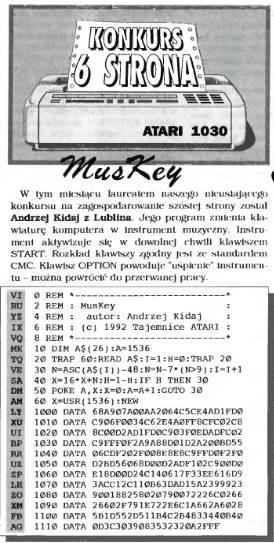 AK: Tak, potem pojawił się „QA” i zacząłem poznawać assemblera. Ciężko to szło, ale jakoś zaczynaliśmy się lubić (poza koniecznością wczytywania „QA” z kasety – koniecznie musiałem mieć stację dysków). Ale udało mi się napisać program „Mus Key”, który pojawił się w „TA” 9/92 (za honorarium kupiłem sobie zegarek elektroniczny, który mam do dziś i który... wciąż działa, chociaż wygląda jak po wojnie atomowej). Po kilku latach udało mi się wymęczyć stację dysków SN-360 i programowanie ruszyło z kopyta. W tym czasie naklepałem całą masę demówek, składających się ze scrolla, prostych efektów wykorzystujących przerwania ANTIC-a i oczywiście moich muzyczek CMC. Zrobiłem też kilka gier, które usiłowałem wydać w „LK Avalon”, ale bezskutecznie. Wszyscy powoli odchodzili już od Atari, ja pisałem programy około 1991-1995 roku, spóźniłem się kilka lat.