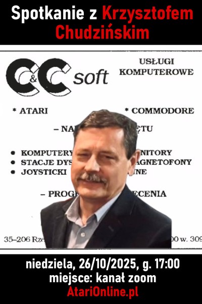 Już dzisiaj o 20:00 spotkanie z grupą Radiance w celu omówienia konstrukcji dema "Unleashed", a w najbliższą niedzielę, 26 października 2025 roku, o godzinie 17:00, na naszym zoomie AtariOnline.pl będzie obecny Krzysztof Chudziński. W starych czasach między innymi prowadził studio komputerowe C&C Soft w Rzeszowie. Studio handlowało pirackim oprogramowaniem, zajmowało się sprzedażą oraz serwisem komputerów Atari i Commodore, pisaniem programów na zlecenie, regeneracją taśm drukarek oraz innymi usługami. Pan Krzysztof pisał programy na Atari i PC, sygnował swoje prace jako "KMC Soft". Jest autorem dwóch artykułów w piśmie "Tajemnice Atari". Pierwsze pod tytułem "Recenzja Turbo 2001" w numerze 6 z 1991 roku oraz wspólnie z Januszem "Jad" Dąbrowskim pod tytułem "Joy Transmission" w numerze 9 z 1993 roku. Rozwiązanie Joy Transmission to interfejs pozwalający przesyłać dane między Commodore 64 i 8-bitowym Atari za pośrednictwem portów joysticka. Oprogramowanie do C64 napisał Janusz Dąbrowski, a do Atari Krzysztof Chudziński. Okazuje się jednak, że pan Chudziński miał więcej związków z L.K. Avalon, a także... z klubem komputerowym Plus w Rzeszowie, w którym uczestniczył również Janusz Pelc czy Janusz B. Wiśniewski. Zapraszamy chętnych na spotkanie z naszym gościem, którego będziemy podpytywać o te wszystkie zamierzchłe historie; znane i nieznane osobistości ówczesnego świata Atari w Rzeszowie, a także o programy i działalność C&C Soft.